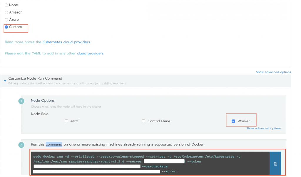2. Once Custom is selected copy and save the registration command used to add new workers to the cluster. This will be used later to build the instance userData.