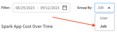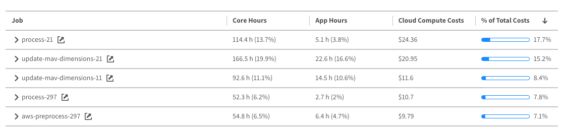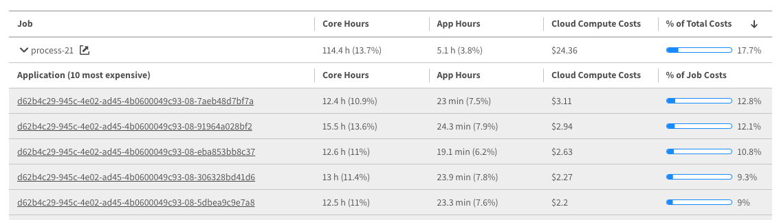 In the Top Spend Summary, you can see a breakdown of costs per application for each job or user. Just click on the job or user name.